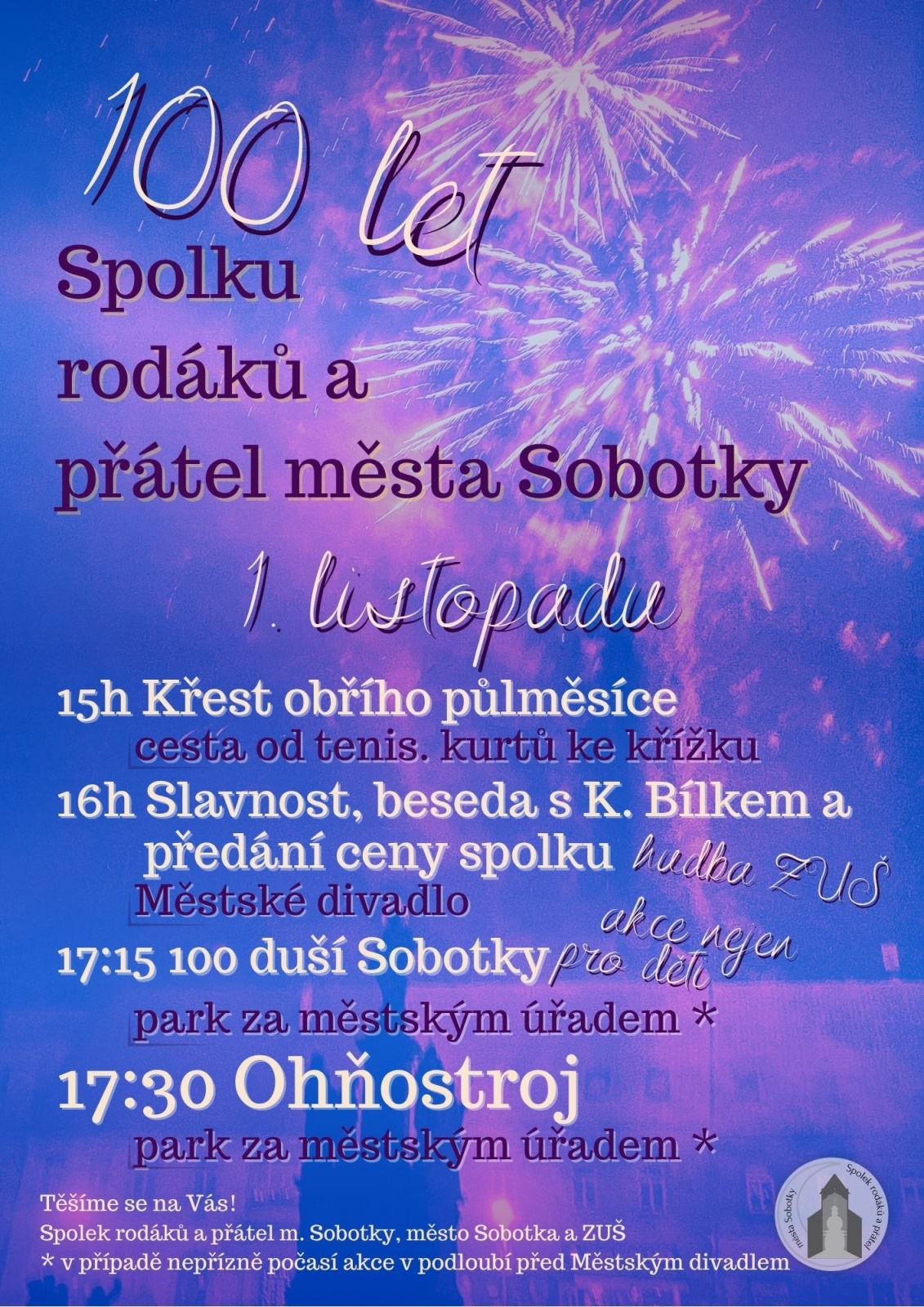 Spolek rodáků a přátel města Sobotky ve spolupráci s městem Sobotka Vás zvou:100 let Spolku rodáků a přátel města Sobotky!Přijďte s námi oslavit kulaté jubileum v sobotu 1. listopadu!