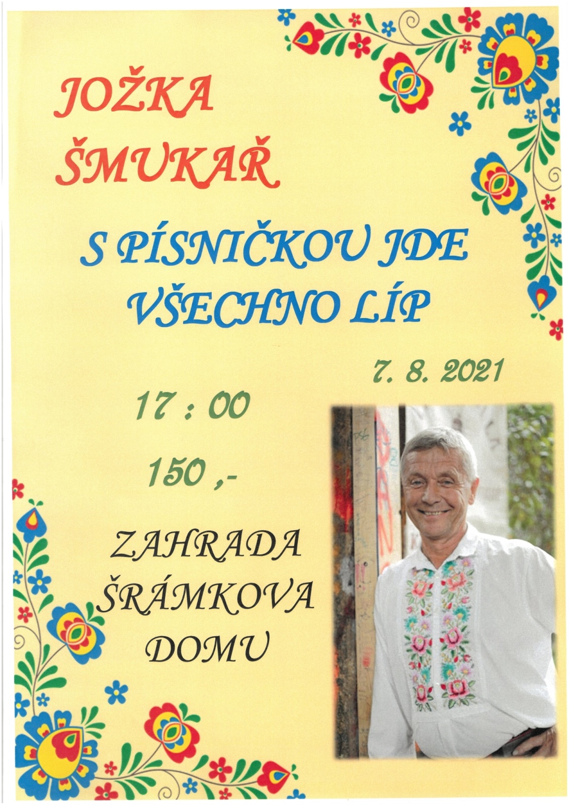 Městské kulturní středisko Sobotka Vás zve na cimbálový koncert Jožky Šmukaře - S písničkou jde všechno líp, 07. 08. 2021 v 17 hodin na zahradě Šrámkova domu. Vstupné 150 ,- Kč.